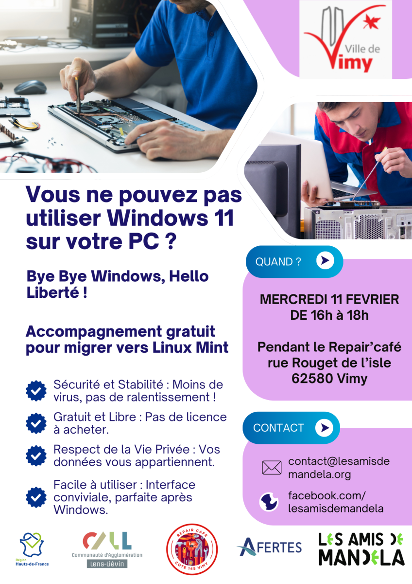 Pour se faire et en partenariat avec la CALL, Mr Renaud ROGEZ, animateur à l'AFERTES (Association pour la Formation, l’Expérimentation et la Recherche en Travail Educatif et Social) et au Repair Café Informatique de la ville d’Avion, interviendra de 16h à 18h.